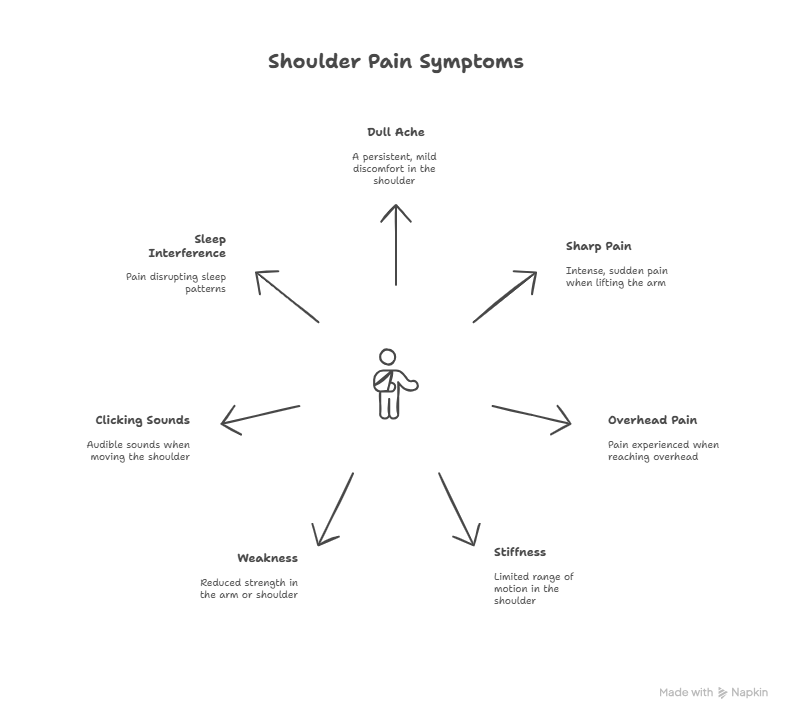 Shoulder pain doesn’t look the same for everyone. Some experience a dull ache, while others get sharp pain when lifting their arm. You might notice: